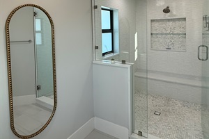 MASTER BEDROOM: King bed and en-suite bathroom with double vanity sinks, a large walk in shower, and a walk in closet. This bedroom has a sliding glass door with direct access to the large lanai. We provide soaps, hair dryer and linens. Just bring your favorite toiletries and sunscreen